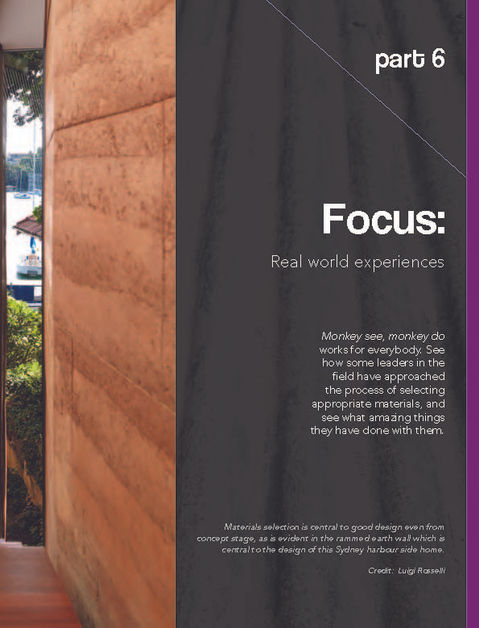 CONTRIBUTORS: Tim Adams, F2 Design; Michael Ambrose, CSIRO; David Baggs, Global GreenTag; Melissa Bright, MAKE architecture; James Cooper, Sanctum Design; Neville Cowland, NOWarchitecture; Dr Robert Crawford, The University of Melbourne; Malay Dave, UNSW; Tom Dobbie, UNSW; Dr Suzanne Grob, procureability; Dr Dominique Hes, The University of Melbourne; Bernard Hockings, Professional builder; Nigel Howard, Clarity Environment; Cathy Inglis, Brickworks Building Products; Trevor King, Trevor King Conservation Planning and Design; Chris Knierim, Designer Constructions Group Pty Ltd and Code Green Pty Ltd; Romilly Madew, Green Building Council of Australia; Klara Marosszeky, Australian Hemp Masonry Company; Kirsty Máté, University of Tasmania; .Anthony Milostic, James Hardie; Caroline Pidcock, Pidcock Architects; Rupert Posner, Good Environmental Choice Australia; Dr Chris Reardon, Suntech Design; Craig Riddle, Living Green Designer Homes; Luigi Rosselli, Luigi Rosselli Architects; Scientia Professor Veena Sahajwalla, UNSW; Jeremy Spencer, Positive Footprints; Lucy Sharman, City of Sydney Council; Dr Heber Sugo, University of Newcastle; Johan Tijssen, Hempcrete Australia; Reece Turner, Greenpeace Australia Pacific; Tone Wheeler, Environa Studio.